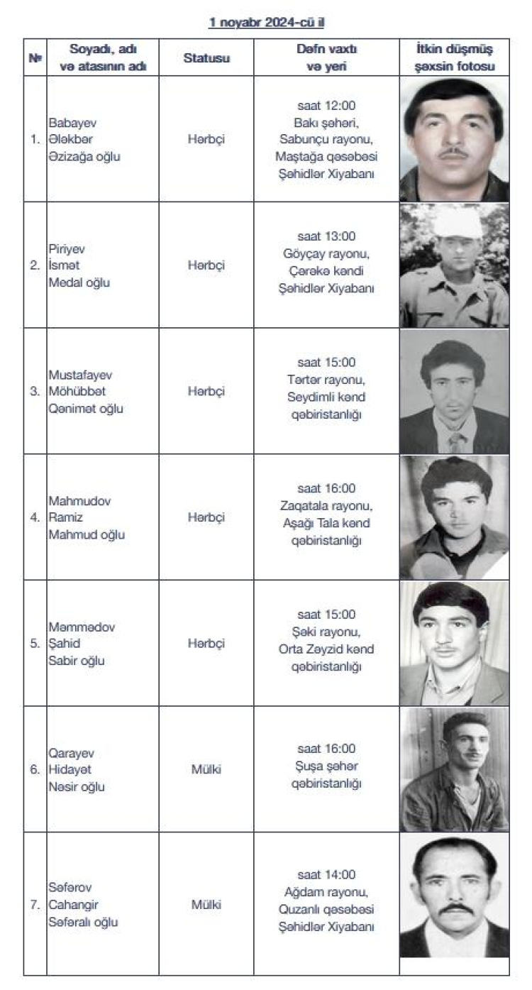 Birinci Karabağ Savaşı’nın 7 şehidi için 1 Kasım 2024 tarihinde cenaze töreni düzenlenecek. Şehitlerden 5'inin asker, 2'sinin sivil olduğu belirtildi.