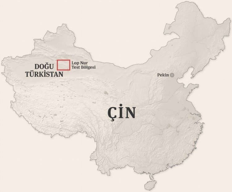 Çin’in 1949 yılında işgal ettiği ve 2017 yılında toplama kampları inşa ederek soykırım politikası yürüttüğü Doğu Türkistan'da, nükleer test alanlarını yeniden inşa ettiği ve nükleer deneme hazırlığında olabileceği tespit edildi. Ayrıca bölgede Uygur Türklerinin de Çin'in 1964'te başlayan nükleer denemeleri nedeniyle sağlık tehditlerine maruz kaldığı biliniyor.