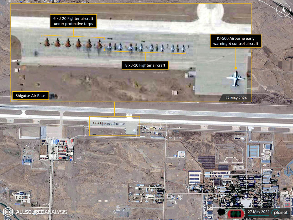 Coğrafi istihbarat firması All Source Analysis tarafından aktarılan 29 Mayıs tarihli uydu görüntülerinde, işgal altındaki Doğu Türkistan'ın Hindistan sınırı yakınlarındaki Şigatse Hava Üssü'nde 6 adet J-20, 8 adet J-10 hayalet savaş uçağı ile 1 adet KJ-500 havadan erken uyarı ve kontrol sistemi (AWACS) uçağının konuşlandırıldığı görüldü.