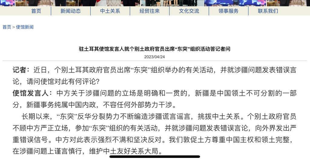Büyükelçilik Sözcüsü konuyla ilgili yaptığıyazılı açıklamada, "Türk hükumet yetkilileri, Çin'in ciddi tutumunu hiçe saydı. 'Doğu Türkistan' Birliğinin ilgili faaliyetlerine katıldı ve (Sincan) ile ilgili konularda yanlış açıklamalar yaparak dış dünyaya ciddi yanlış sinyaller verdi. Çin, güçlü memnuniyetsizliğini ve buna karşı kesin muhalefetini ifade ediyor. Türk tarafını Çin'in egemenliğine ve toprak bütünlüğüne saygı duymaya, (Sincan) ile ilgili konularda söz ve eylemlerinde dikkatli olmaya ve Çin ile olan dostane ilişkilerinin genel durumunu korumaya çağırıyoruz" ifadelerini kullandı.
