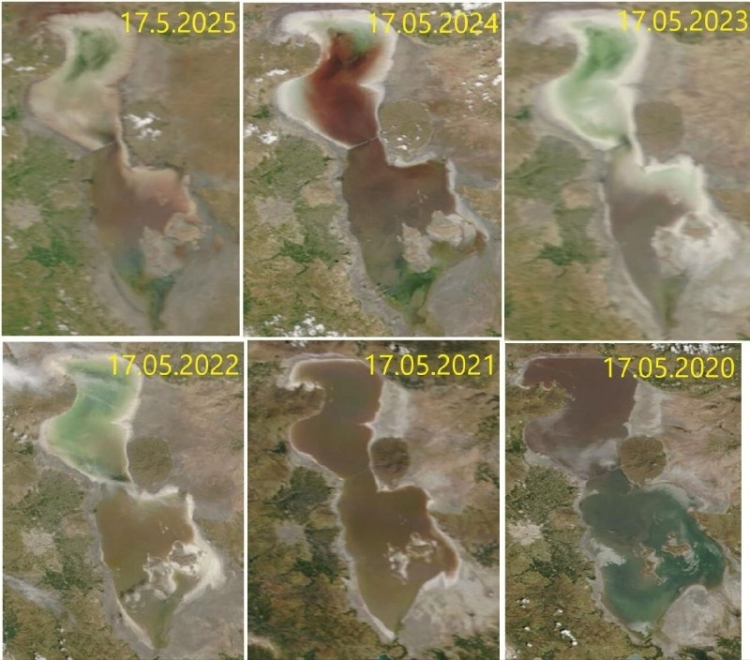 Dünyanın 2. büyük tuz gölü olan Güney Azerbaycan'daki Urmiye Gölü, su kaynaklarının yanlış yönetilmesi ve gölün üzerine kurulan 23 barajın inşası nedeniyle yok olma tehlikesi altında. Çeşitli bitki ve hayvan türleri için önemli bir yaşam alanı olan gölün Tebriz medyasında, 17 Mayıs 2025 tarihindeki son durumuna ait görsel paylaşıldı.