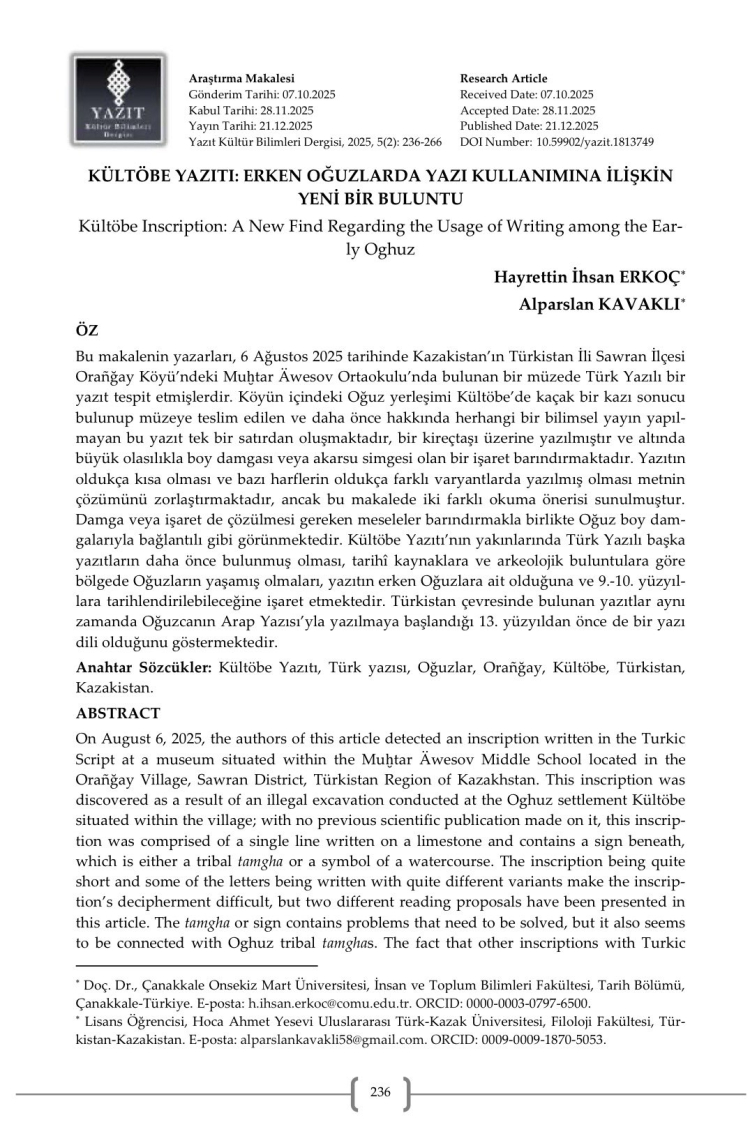 Kazakistan’ın Türkistan şehri yakınlarındaki Orañğay köyünde bulunan Oğuz yerleşimi Kültöbe’de kaçak bir kazıda çıkan ve 6 Ağustos 2025 tarihinde değerli rehberim Alparslan Kavaklı’yla köyün ortaokulundaki müzeye yaptığımız ziyaret sırasında tespit ettiğimiz, Oğuzlara ait olup 9.-10. yüzyıllardan kaldığını düşündüğümüz Kültöbe Yazıtı’yla ilgili makalemiz bugün yayımlanmıştır. Türkoloji camiasına hayırlı uğurlu olması dileğiyle.