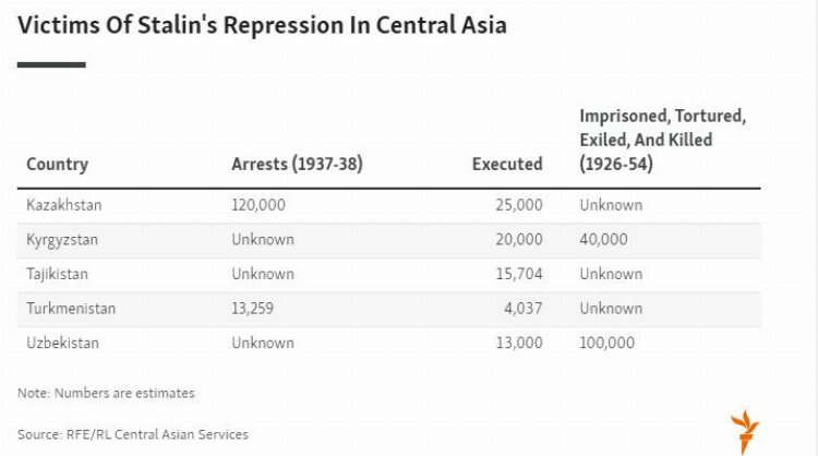 ABD'li yazar Robert Conquest, 1920'lerden 1950'li yıllara kadar Sovyet baskısı yüzünden 12 milyonu aşkın insanın yaşamını yitirdiğini ifade etti. Özellkle 1937 ile 1938 yılları arasında Kazakistan'da yaşayan 25 binden, Kırgızistan'da yaklaşık 10 binden, Özbekistan'da 13 binden ve Tacikistan'da yaklaşık 15 bin 700'den fazla aydın, milliyetçi ve Pan-Türkist, Sovyet rejimince "tehlikeli" oldukları gerekçesiyle çok sayıda insan idam edildi.