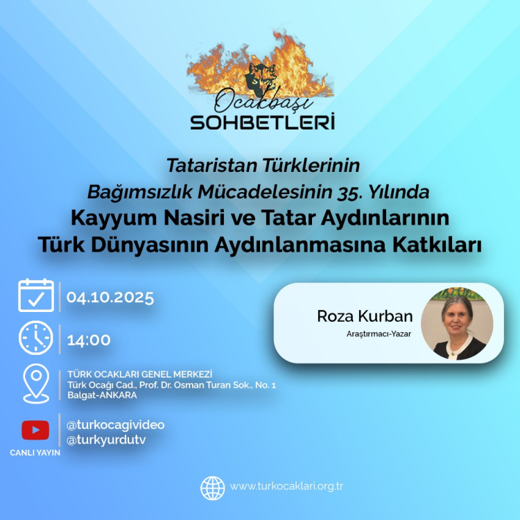 "Tataristan Türklerinin Bağımsızlık Mücadelesinin 35. Yılında Kayyum Nasiri ve Tatar Aydınlarının Türk Dünyasının Aydınlanmasına Katkısı" başlıklı konferans 4 Ekim 2025 tarihinde Türk Ocakları Genel Merkezinde gerçekleştirilecek. Saat 14.00'te başlayan konferans eş zamanlı olarak Türk Ocaklarının YouTube kanalında ve Türk Yurdu Tv'de canlı yayın olarak verilecek.