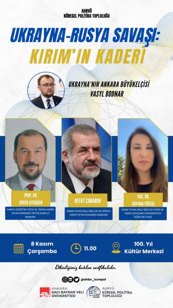 KTMM Başkanı Çubarov, yarın Ankara Hacı Bayram Veli Üniversitesine (AHBVÜ) konuk olacak. Çubarov, üniversitenin 100. Yıl Salonu'nda gerçekleştirilecek olan ve Ukrayna'nın Ankara Büyükelçisi Vasıl Bodnar'ın davetli olacağı "Ukrayna-Rusya Savaşı: Kırım'ın Kaderi" başlıklı konferansta konuşmacı olacak. Ayrıca konferansta DQTK Teftiş Kurulu Başkanı, AHBVÜ Öğretim Üyesi Prof. Dr. Enver Aydoğan ile KTMM üyesi, İstanbul Üniversitesi Öğretim Üyesi Doç. Dr. Gayana Yüksel de konuşmacı olarak yer alacak.