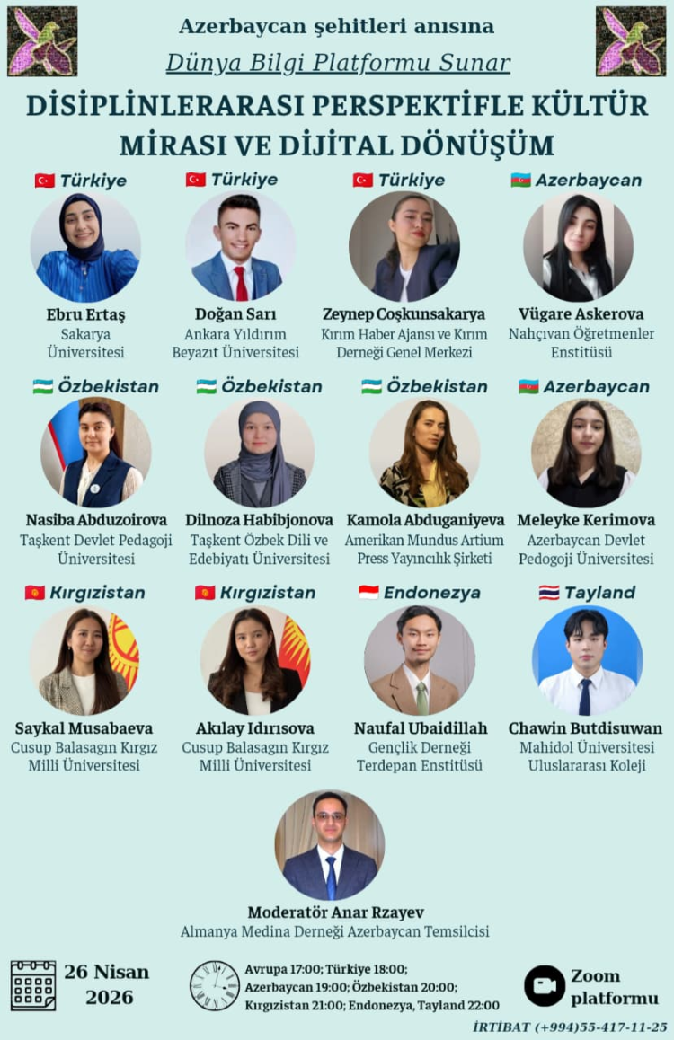 "Disiplinlerarası Perspektifle Kültür Mirası ve Dijital Dönüşüm" başlıklı konferans, Dünya Bilgi Platformu tarafından Azerbaycan şehitleri anısına düzenlendi. 26 Nisan 2026 tarihinde çevrim içi olarak tertip edilen programda Türk dünyasının dört bir yanından gençler bir araya geldi.