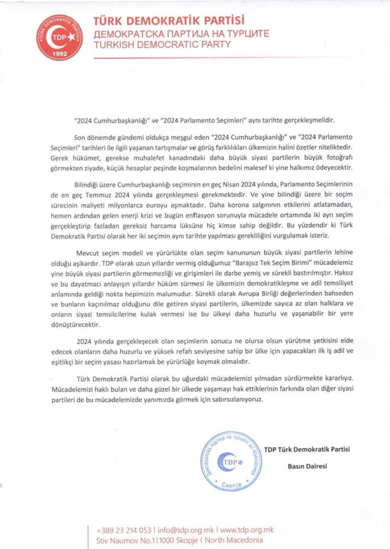 Kuzey Makedonya'daki Türkler tarafından kurulan ve 1990 yılından bu yana faaliyetlerini sürdüren Türk Demokratik Partisi (TDP), ülkedeki yapılacak yasama ve yürütme organı seçimlerine ilişkin bir açıklama yayımladı. TDP tarafından yapılan yazılı açıklamada 2024 yılında yapılması gereken cumhurbaşkanlığı ve parlamento seçimlerinin aynı tarihte yapılması gerektiği belirtildi.