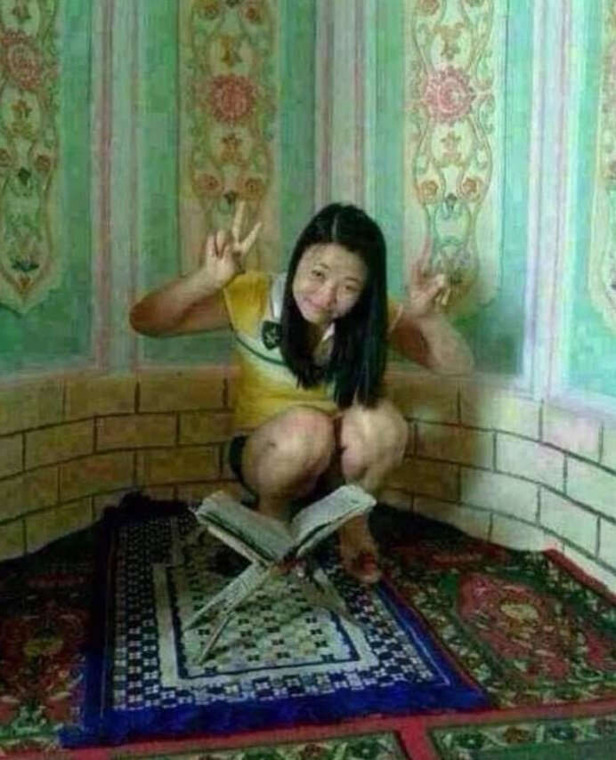 Çin işgalindeki Doğu Türkistan'da binlerce senelik camiler, Çin Komünist Partisi tarafından yıkılmaya devam ediyor. Çinliler ise Müslümanlarla alay etmeye ediyor. Çin merkezli sosyal medya hesaplarından paylaşılan görüntülerde, Doğu Türkistan'da olduğu ileri sürülen bir camide Çinli kadınlar, mihrap önünde ayakkabı ile poz veriyor. Diğerleri ise mihrap önündeki zemine koyulan Kur'an-ı Kerim önünde yarı çıplak poz veriyor.