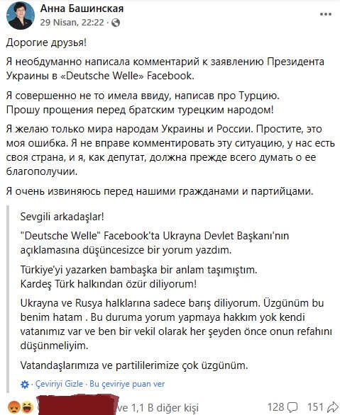 Kazakistan Amanat Partisi ve Almatı Keneşi üyesi Rus kökenli Anna Başinskaya, Ukrayna Cumhurbaşkanı Volodımır Zelenskıy’e seslenerek skandal sözler sarf etti. İfadeleriyle skandala doymayan Başinskaya, Zelenskıy’e hitaben "Kırım'a saldıracağına, Türkiye'ye saldır" dedi. Kısa sürede sosyal medyada yayılan söz konusu konuşma, Kazakistan’da büyük tepkiye neden oldu. Kazakistan "Dil Maydanı" mensupları Anna Başinskaya’nın bu konuşmasından dolayı özür dilemesi ve istifa etmesi gerektiğini belirterek Amanat Partisine tepki gösterdi.