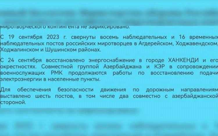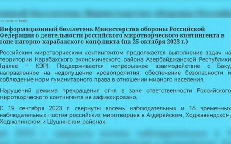 Rusya Savunma Bakanlığı, Azerbaycan’ın toprak egemenliği ve bütünlüğüne saygı göstermek zorunda kaldı. Bölgede bulunan sözde Rus Barış Gücü tarafından raporlanan ve Rusya Savunma Bakanlığı’nın internet sitesinde yer alan günlük bültenlerde, Ruslar geri adım attı.