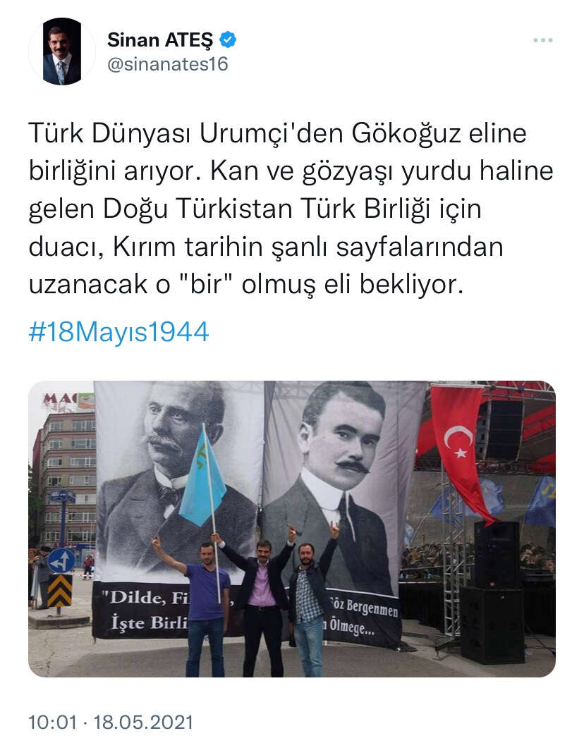 Geçen hafta Cuma namazı çıkışında silahlı saldırı sonucunda hayatını kaybeden Ülkü Ocakları Eğitim ve Kültür Vakfının eski Genel Başkanı ve Hacettepe Üniversitesi Öğretim Üyesi Doç. Dr. Sinan Ateş’in cinayeti henüz aydınlatılamadı. Doç. Dr. Ateş, Türk dünyasına verdiği destek ile hatırlanıyor. Doğu Türkistan, Kırım, Kerkük başta olmak üzere Türk dünyasının mazlum coğrafyalarına ses olan Sinan Ateş, sosyal medya üzerinden vermiş olduğu destek mesajları ile unutulmadı.