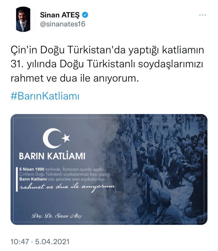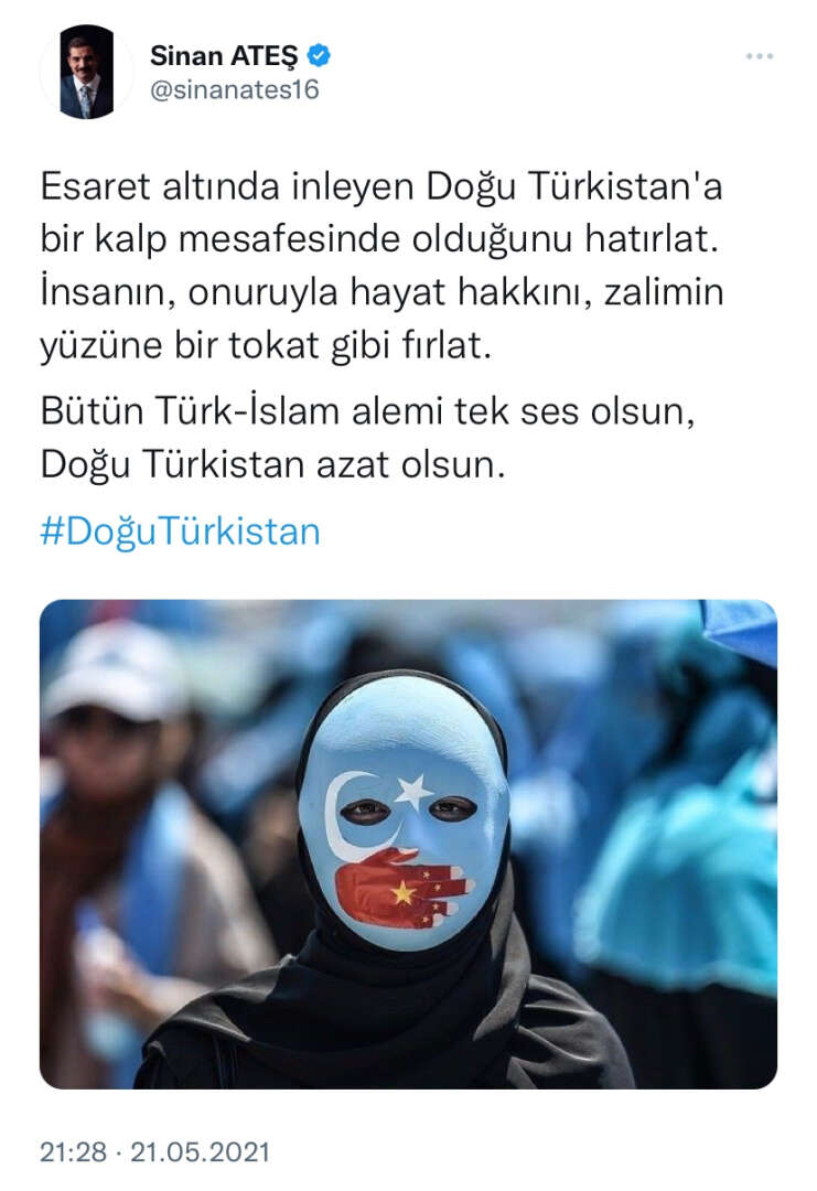 Cuma çıkışı suikast sonucu hayatını kaybeden Ülkü Ocaklarının bir önceki Genel Başkanı, Doç. Dr. Sinan Ateş, Doğu Türkistan'a verdiği destek ile hatırlanıyor.