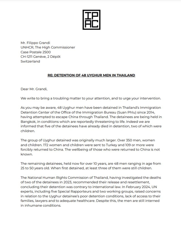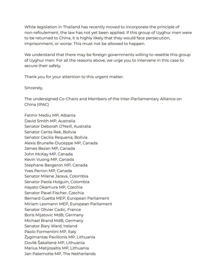 Çin'e karşı uluslararası bir kuruluş olan Parlamentolar Arası İttifak 10 Kasım 2024 tarihinde, Birleşmiş Milletlere (BM) kritik bir çağrıda bulundu. BM Göç Yüksek Komiseri Filippo Grandi’ye seslenilen mektupta, Tayland’daki Uygur Türklerinin durumunun çok kötü olduğu ve acil bir müdahale gerektiği vurgulandı. 26 ülkeden 50’ye yakın milletvekilinin imzaladığı açık mektupta, tutukluların insan hakları ihlalleri ve kötü sağlık koşullarının, daha fazla insanın hayatını tehlikeye atacağı uyarısı yapıldı.