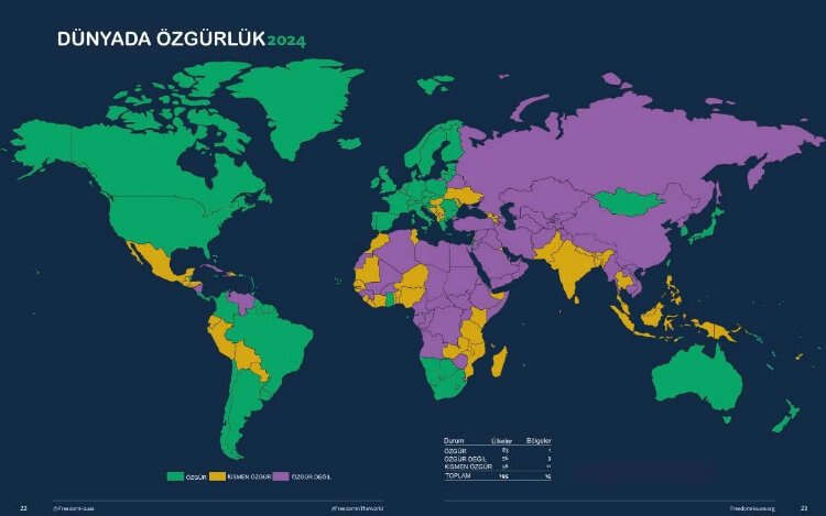 Küresel çapta demokrasi, insan hakları ve hukuk devleti ilkelerini araştıran Freedom House kuruluşu "Dünyada Özgürlük 2024" konulu yeni araştırma raporunu yayımladı. Örgütün yayımladığı raporda Türk devletleri "özgür olmayan devletler" kategorisinde yer aldı.