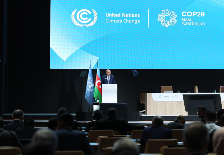 Türkiye Cumhuriyeti Cumhurbaşkanı Recep Tayyip Erdoğan, "Dünya Liderleri İklim Eylem Zirvesi" nde konuşan liderler arasındaydı. Erdoğan, konuşmasının başında ev sahipliğinde dolayı Azerbaycan Cumhurbaşkanı İlham Aliyev'e teşekkür etti. Türkiye’nin iklim krizinin menfi etkilerinin en yoğun hissedildiği ülkeler arasında olduklarını vurgulayan Erdoğan, “2053 yılı için net sıfır emisyona ulaşma ve Yeşil Kalkınma vizyonumuz ekseninde kilit sektörlerimizi dönüştürüyoruz. Yeşil finans stratejisini uygulama ve Ulusal Yeşil Taksonomi oluşturma gayretlerimiz devam ediyor. Emisyon Ticaret Sistemi'ni de ihtiva eden iklim kanunumuzu çok yakında Meclis’imize sunacağız." diyerek Türkiye’nin iklim değişikliği karşısında hayata geçirdiği çalışmalara işaret etti.