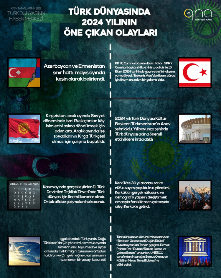 Bu bağlamda kültürel mirasın korunması çabalarından, Ortak Alfabe Bildirisine ve ortak harita çalışmaları gibi iş birliği projelerine kadar birçok konu, Türk dünyasında bu yıl öne çıkan gündem başlıklarını oluşturdu. Yıl boyunca Türk dünyası gündeminin nabzını tutan Kırım Haber Ajansı (QHA) ise, yılın öne çıkan gündem başlıklarını sizler için derledi.