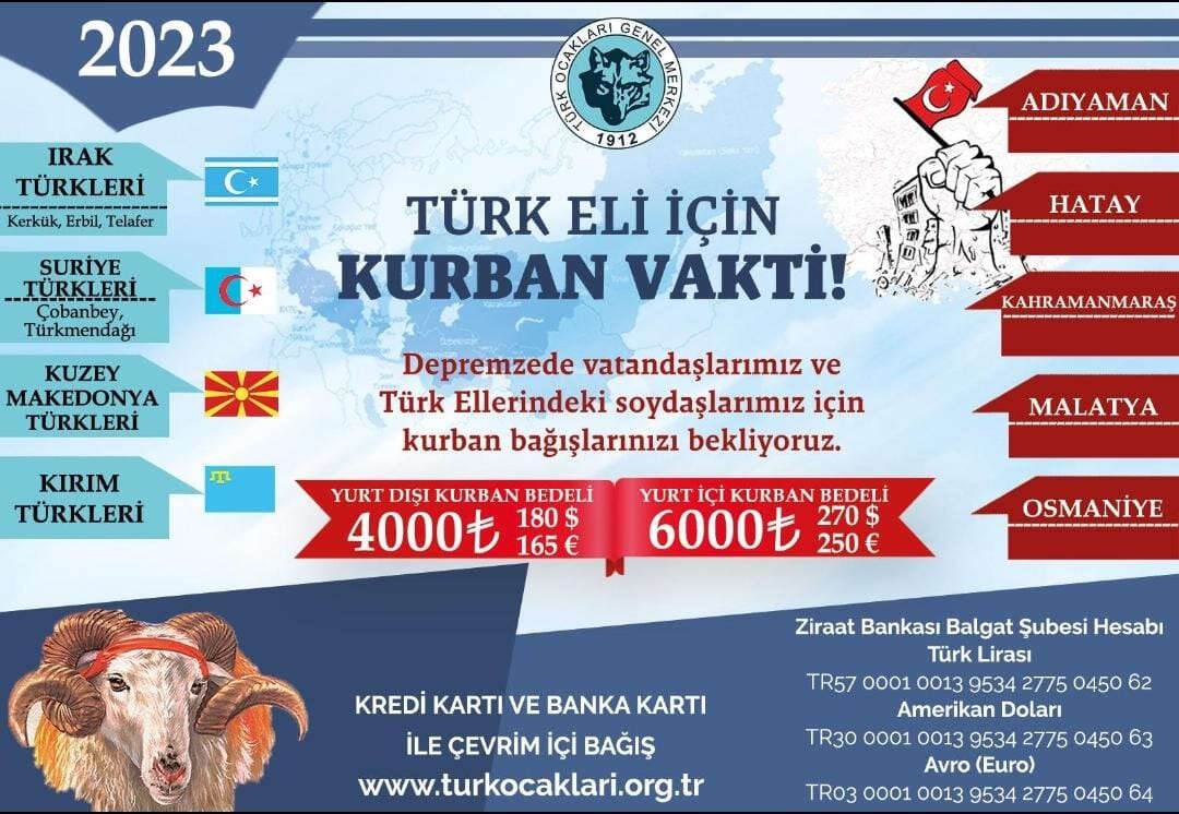 Türk Ocakları Genel Merkezi "Türk Eli İçin Kurban Vakti" isimli kampanyayla topladığı yardımla Türkiye'deki deprem bölgelerine, Irak Türklerine, Suriye Türklerine, Kuzey Makedonya Türklerine ve Kırım Tatarlarına kurban bağışı yapacak.