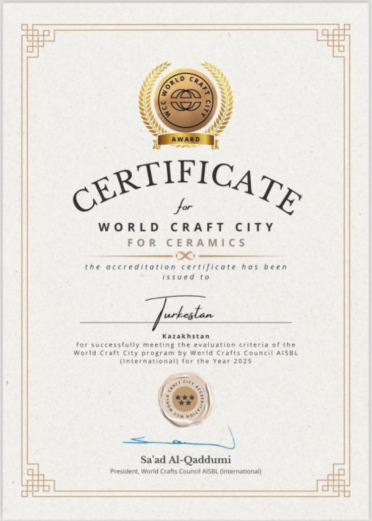Dünya Zanaat Konseyi (The World Crafts Council) kararı ve onayı ile Kazakistan'ın Türkistan şehrine “Dünya El Sanatları Kenti” statüsü verildi.