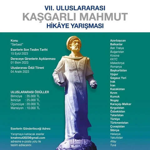 Uluslararası Türk Kültür Teşkilatı (TÜRKSOY) ve Avrasya Yazarlar Birliği, Türkiye'nin kuruluşunun 100. yılına özel "Uluslararası Kaşgarlı Mahmut Hikaye Yarışması" düzenliyor.