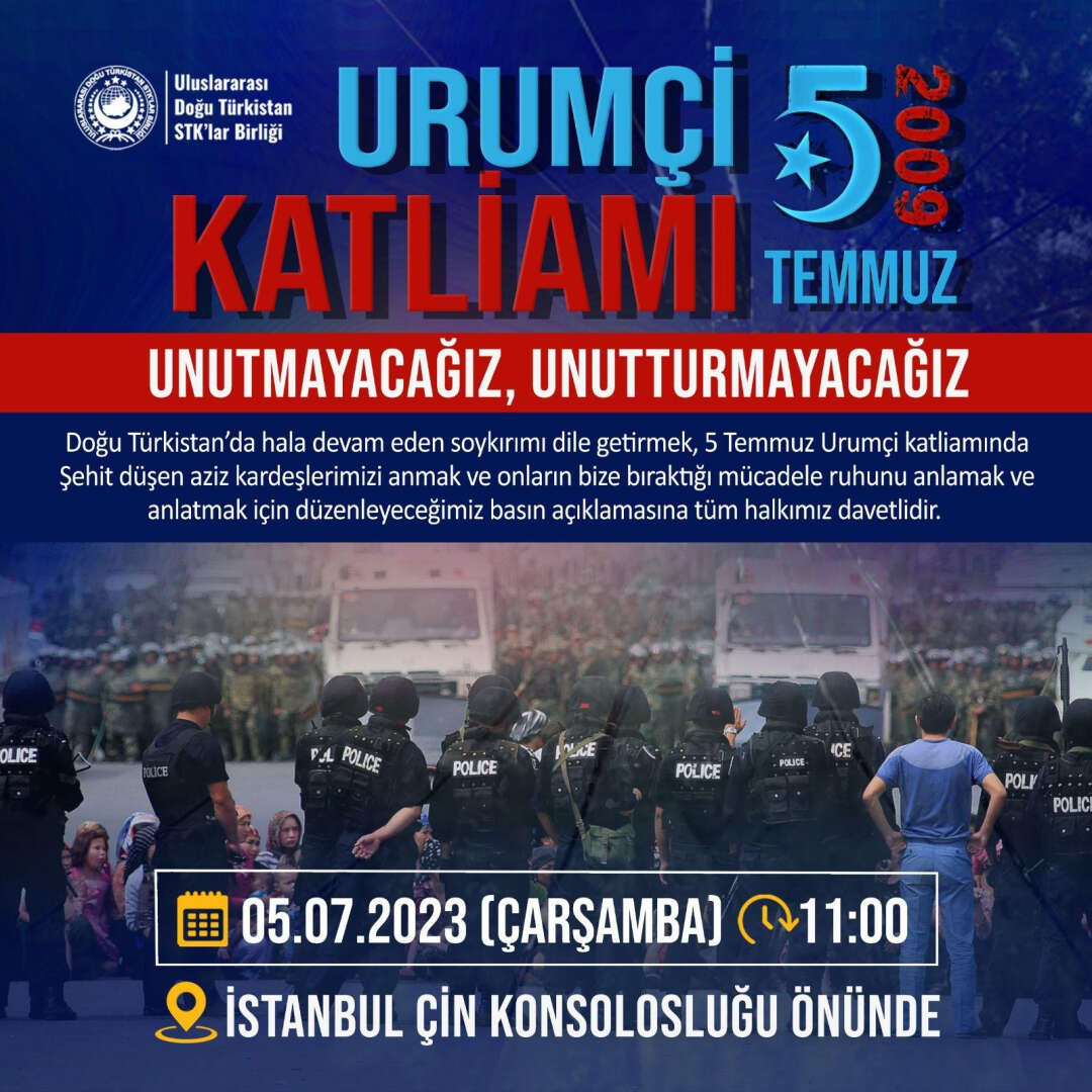 Uluslararası Doğu Türkistan STK’lar Birliği, "5 Temmuz Ürümçi Katliamı Unutmayacağız, Unutturmayacağız" sloganıyla "5 Temmuz günü, Ürümçi Katliamı ve şehitlerini anma maksadıyla İstanbul’daki Çin Başkonsolosluğu önünde Doğu Türkistan’da hala devam eden soykırımı dile getirmek, 5 Temmuz Ürümçi Katliamı'nda şehit düşen aziz kardeşlerimizi anmak ve onların bize bıraktığı mücadele ruhunu anlamak ve anlatmak için düzenleyeceğimiz basın açıklamasına tüm halkımız davetlidir" çağrısı yaptı.