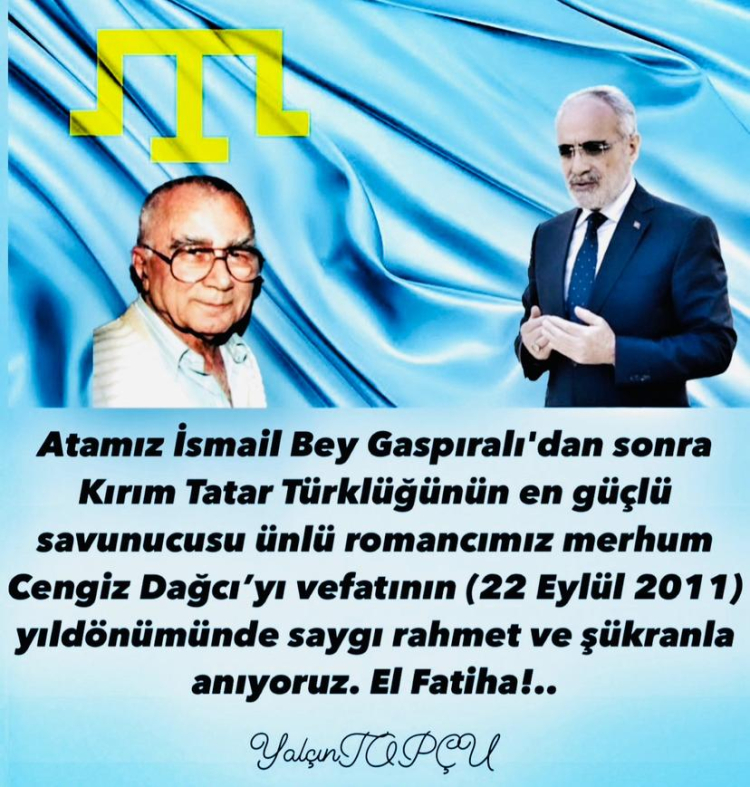 Atamız İsmail Bey Gaspıralı'dan sonra Kırım Tatar Türklüğünün en güçlü savunucusu ünlü romancımız merhum Cengiz Dağcı'yı vefatının (22 Eylül 2011) yıl dönümünde saygı, rahmet ve şükranla anıyoruz. El-Fatiha...