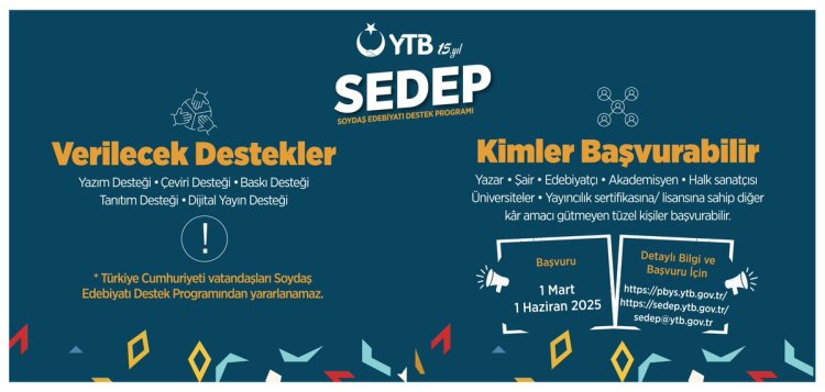 YTB tarafından yürütülen Soydaş Edebiyatı Destek Programı (SEDEP) 2025 için başvuru süreci devam ediyor. Program kapsamında, Türk dünyasının edebî ve kültürel gelişiminin desteklenmesi ve bu birikimin uluslararası alanda tanıtılması hedefleniyor.