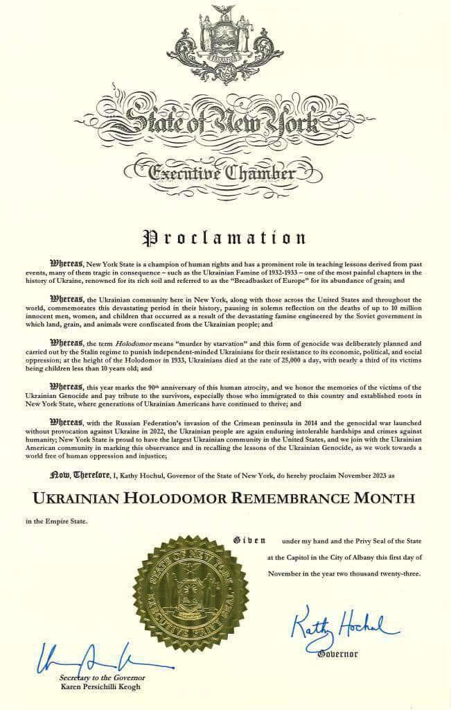 ABD'nin New York eyaleti, 1932-1933 yıllarında Sovyetlerin Ukrayna halkına karşı işlediği Holodomor Soykırımı'nı tanıdı. Böylelikle, ABD'de Holodomor'u soykırım olarak tanıyan 34 eyalet oldu.