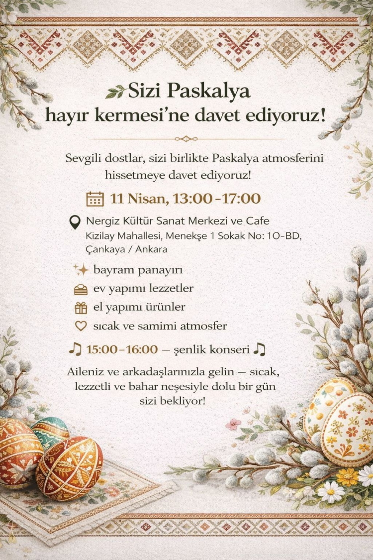 “Nergiz Kültür Sanat Merkezi ve Cafe”de saat 13.00 ve 17.00 arasında tertip edilecek olan “Paskalya Hayır Kermesi”, Ukraynalılar başta olmak üzere birçok katılımcıya sıcak ve samimi bir atmosfer sunacak.