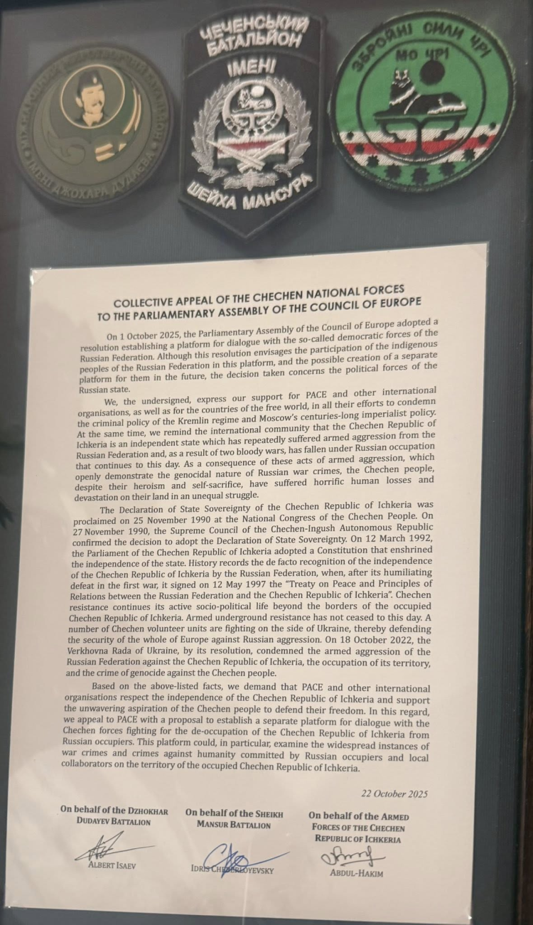 Ukrayna Parlamentosu Verhovna Radanın (Verkhovna Rada) Avrupa Konseyi Parlamenter Meclisi (AKPM) Daimî Delegasyonu, Ukrayna ordusunda Ukraynalılarla omuz omuza savaşan Çeçen muharip birlikleri için resmî başvuruda bulundu.