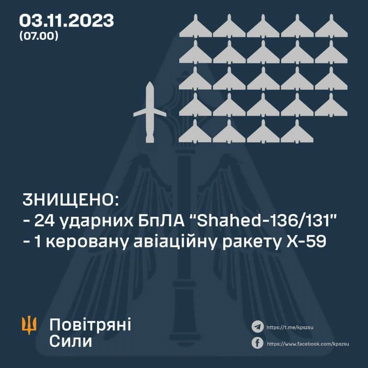 Ukrayna Genelkurmay Başkanlığından bu sabah yapılan açıklamada, “Rus işgal güçleri, 38 Şahed tipi SİHA ve bir Kh-59 güdümlü hava füzesini kullanarak 2 Kasım’ı 3 Kasım’a bağlayan Ukrayna’ya bir saldırı daha gerçekleştirdi.” ifadeleri kullanıldı.