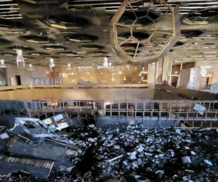 İşgalci Rusların 30 Ekim 2023 tarihindeki bombardımanı sonucunda Oles Gonçar Herson Bölge Bilim Kütüphanesi'nin dördüncü katı neredeyse tamamen yanıp küle döndü.