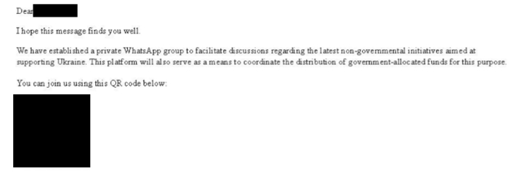 Gönderilen sahte mesajların içeriğini ise sözde yardım kampanyaları oluşturuyor. Mesajda, "Ukrayna sivil toplum kuruluşlarını (STK) desteklemeyi amaçlayan en son hükûmet dışı girişimler" konulu bir WhatsApp grubuna katılma daveti bulunuyor.