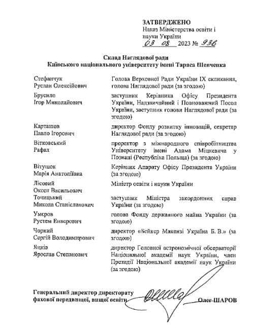 Ukrayna Eğitim ve Bilim Bakanlığı, Taras Şevçenko Kıyiv Ulusal Üniversitesi Denetim Kurulunu üyelerini belirledi. İlgili karar dün Taras Şevçenko Kıyiv Ulusal Üniversitesinin resmi sayfasında paylaşıldı.