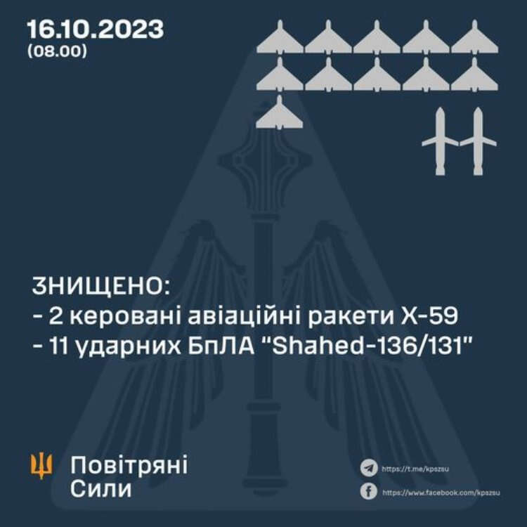 İşgalci Rusya, 15 Ekim’i 16 Ekim'e bağlayan gece, Ukrayna’ya füze ve İran yapımı kamikaze silahlı insansız hava araçları (SİHA) ile saldırdı. Ukrayna ordusu, fırlatılan 5 seyir füzesinden 2’sini ve 12 SİHA’dan 11’ini düşürdü.