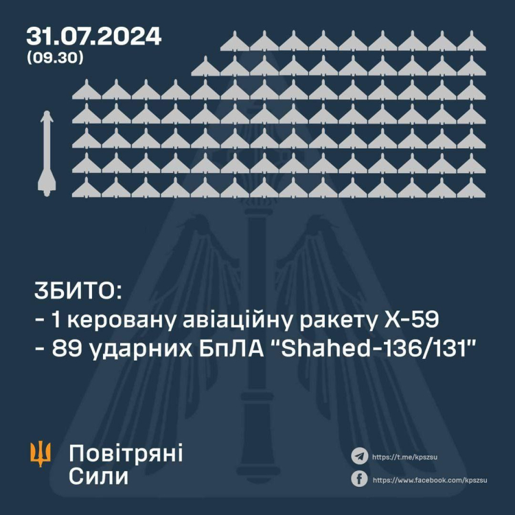 Ukrayna Hava Kuvvetleri Komutanı Mıkola Oleşçuk (Mykola Oleshchuk) 31 Temmuz'da yaptığı açıklamada, gece saatlerinde Rus ordusunun Ukrayna’ya bir hava füzesi ve 89 SİHA ile saldırdığını aktardı. İşgalcilerin ana hedefinin başkent Kıyiv ve Kıyiv bölgesi olduğunu belirten Oleşçuk, Ukrayna birliklerinin işgalcilere ait tüm SİHA'ları ve hava füzesini düşürdüğünü duyurdu.