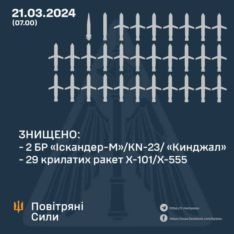 Ukrayna Hava Kuvvetleri Komutanı Mıkola Oleşçuk, 20 Mart’ı 21 Mart’a bağlayan gece Rusya’nın 11 Tu-95MS stratejik bombardıman uçağından Ukrayna’ya karşı 2 İskender-M balistik füzesi ve 29 Kh101/Kh-555 seyir füzesi ateşlediğini bildirdi.