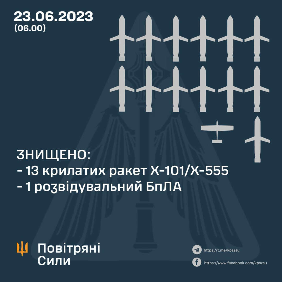 Ukrayna Hava Kuvvetlerinden yapılan açıklamada, “Gece saatlerinde Rus ordusu stratejik uçaklarıyla Ukrayna’ya saldırdı. İşgalcilere ait 13 Kh-101/ Kh-555 seyir füzesinin hepsi, çoğu Hmelnıtskıy bölgesinde olmak üzere hava savunma birlikleri tarafından düşürüldü. Bu sefer Rus işgal güçleri, Hmelnıtsık bölgesindeki hava üssünü hedef aldı. Füzeler, gece yarısı civarında Hazar Denizi'nden dört Tu-95MS bombardıman uçağından fırlatıldı.” denildi.