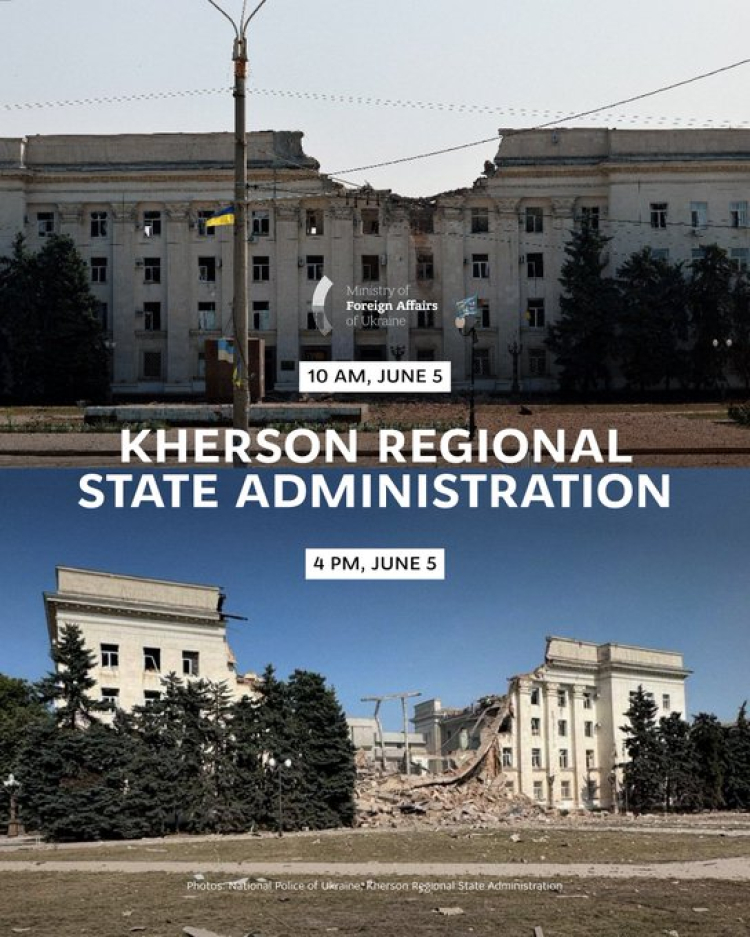 Herson Bölgesi Askeri İdaresi Başkanı Oleksandr Prokudin, yaptığı açıklamada, saldırıda tahrip edilen binanın görüntüsünü paylaşarak, “Ruslar Herson Valiliği binasını yok etti” ifadelerini kullandı.