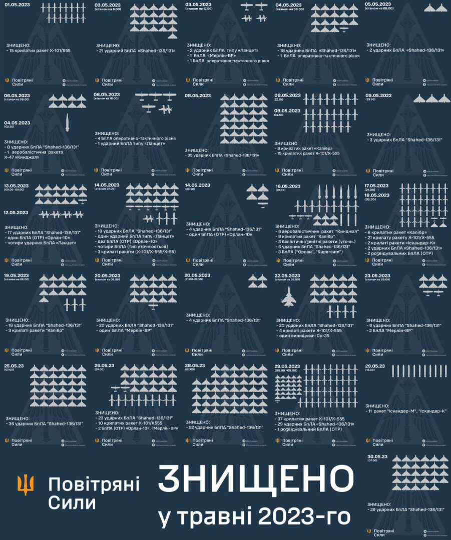 Ukrayna Hava Kuvvetleri, dün sosyal medya üzerinden Mayıs 2023’te imha edilen Rus füzelerinin ve SİHA’larının sayısını gösteren infografiği paylaştı. Kyiv Post gazetesi ise paylaşılan infografiği inceleyerek mayıs ayında füze ve SİHA saldırıları için Rusya’nın yaklaşık 1.7 milyar dolar harcadığını hesapladı.