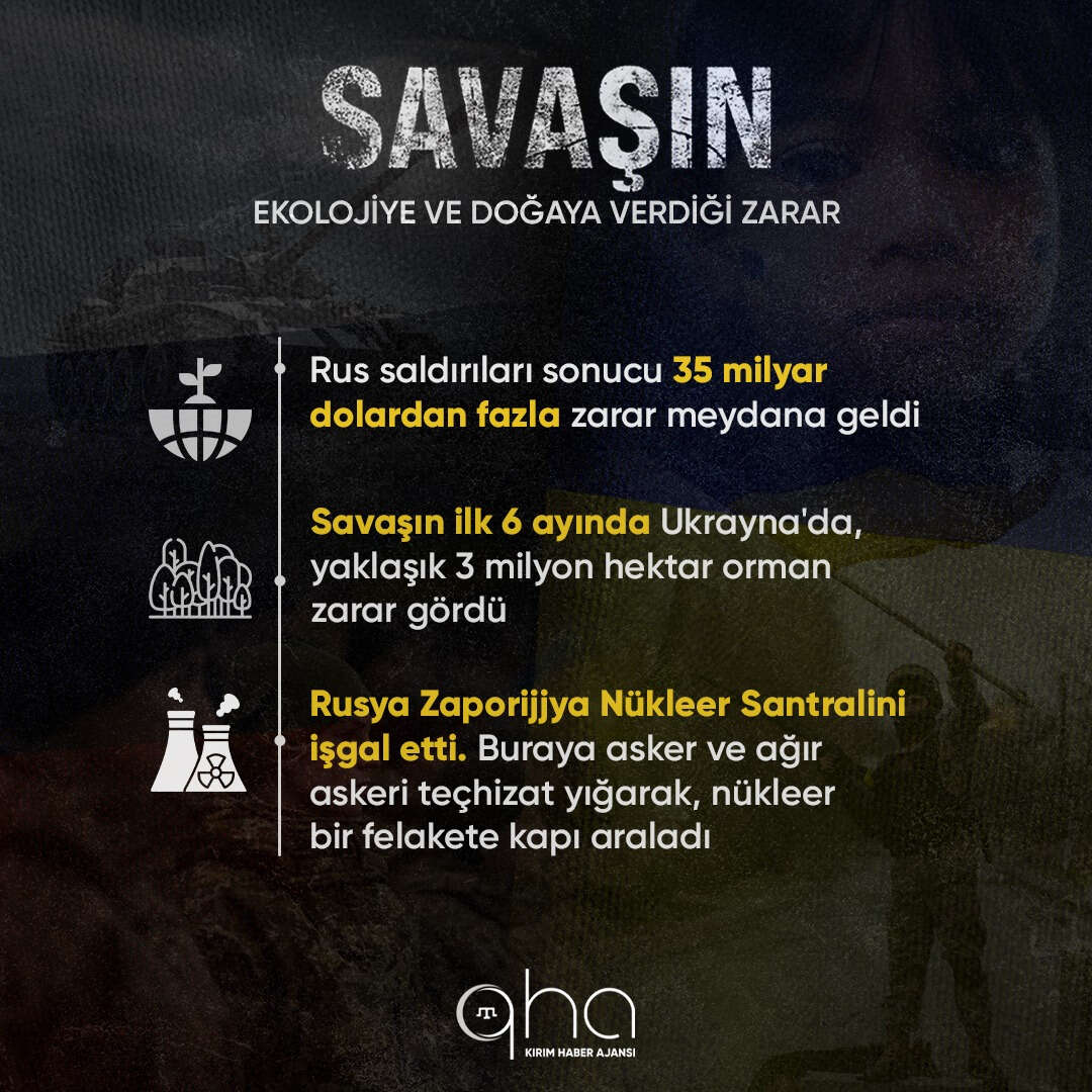 Ukrayna Savunma Bakanı Oleksiy Reznikov, 2023’ün Ocak ayı başında yaptığı açıklamada, Rusya’nın işgal saldırılarıyla, Ukrayna çevresine verdiği zararın 35,3 milyar doları aştığını duyurarak, milyonlarca hektarlık doğa koruma alanının tehdit altında bulunduğunu vurguladı. Rus saldırıları sonucu sadece savaşın ilk 6 ayında Ukrayna'da, yaklaşık 3 milyon hektar orman zarar gördü.