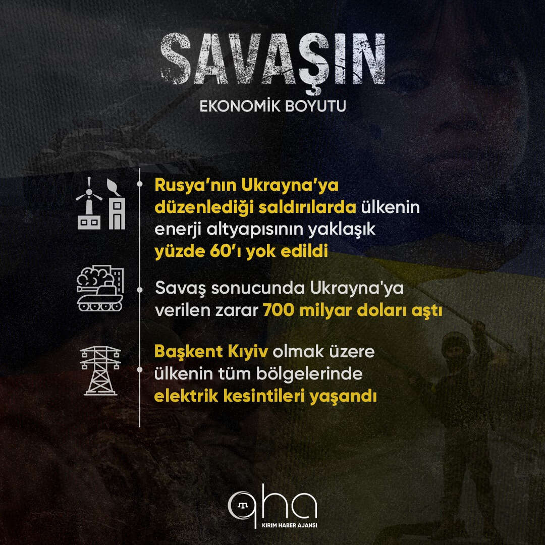 Rusya’nın Ekim ayında başlayarak Ukrayna’nın enerji altyapı tesislerine yönelik düzenlediği çoklu füze saldırılarında, ülkenin enerji altyapısının yaklaşık yüzde 60’ı yok edildi veya zarar gördü. Başta başkent Kıyiv olmak üzere ülkenin tüm bölgelerinde elektrik kesintileri yaşandı.