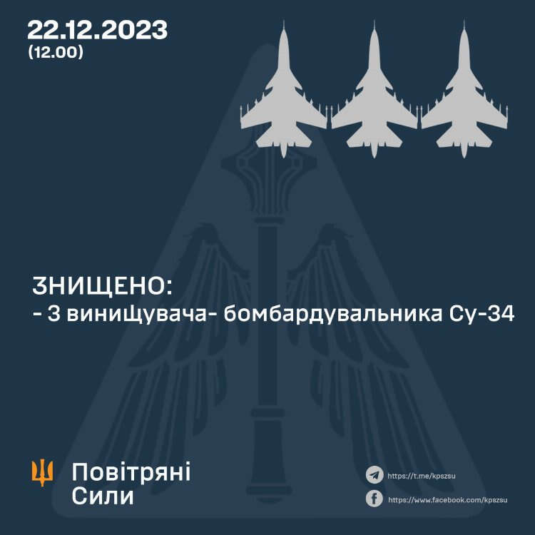 Ukrayna Hava Kuvvetleri Komutanı Mıkola Oleşçuk, sosyal medya üzerinden yaptığı açıklamada, “Bugün öğlen saatlerinde güney istikametinde 3 Rus Su-34 avcı bombardıman uçağı imha edildi! Emekleriniz için hepinize teşekkür ediyorum! Birlikte zafere!” ifadelerini kullandı.