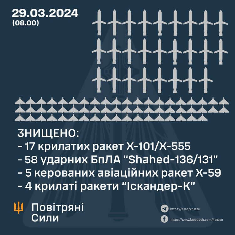 Bununla birlikte Rus ordusunun gece boyunca Ukrayna'ya 3 adet Kh-47M2 Kinjal aero balistik füzesi, 2 İskender-M balistik füzesi, 9 adet Kh-59 güdümlü hava füzesi, 4 adet İskender-K seyir füzesi, 21 Kh-101/Kh-555 seyir füzesi olmak üzere toplamda 29 füze ile saldırdığı belirtilerek Ukrayna ordusunun işgalcilere ait 26 füzeyi düşürdüğü ifade edildi.