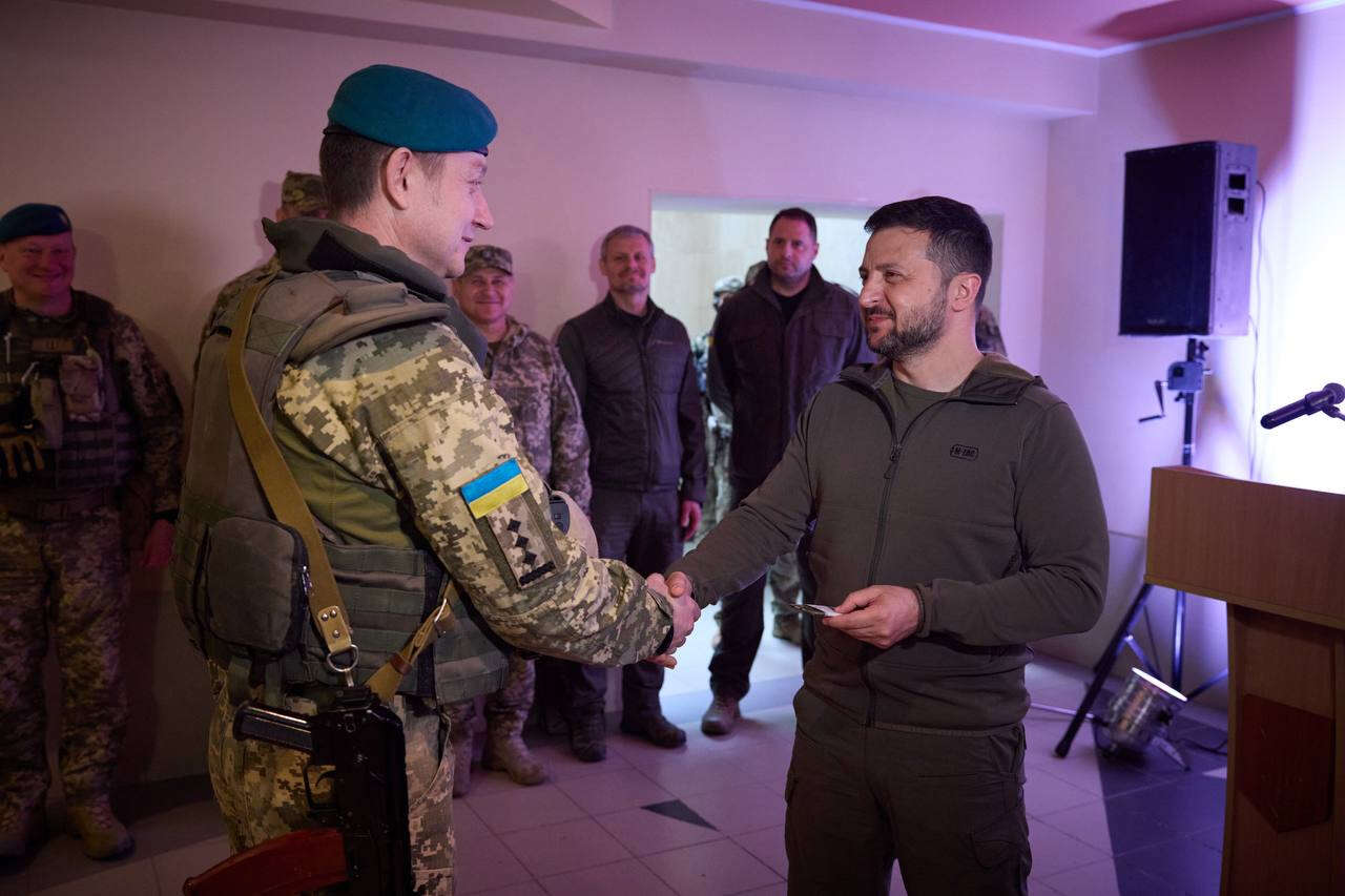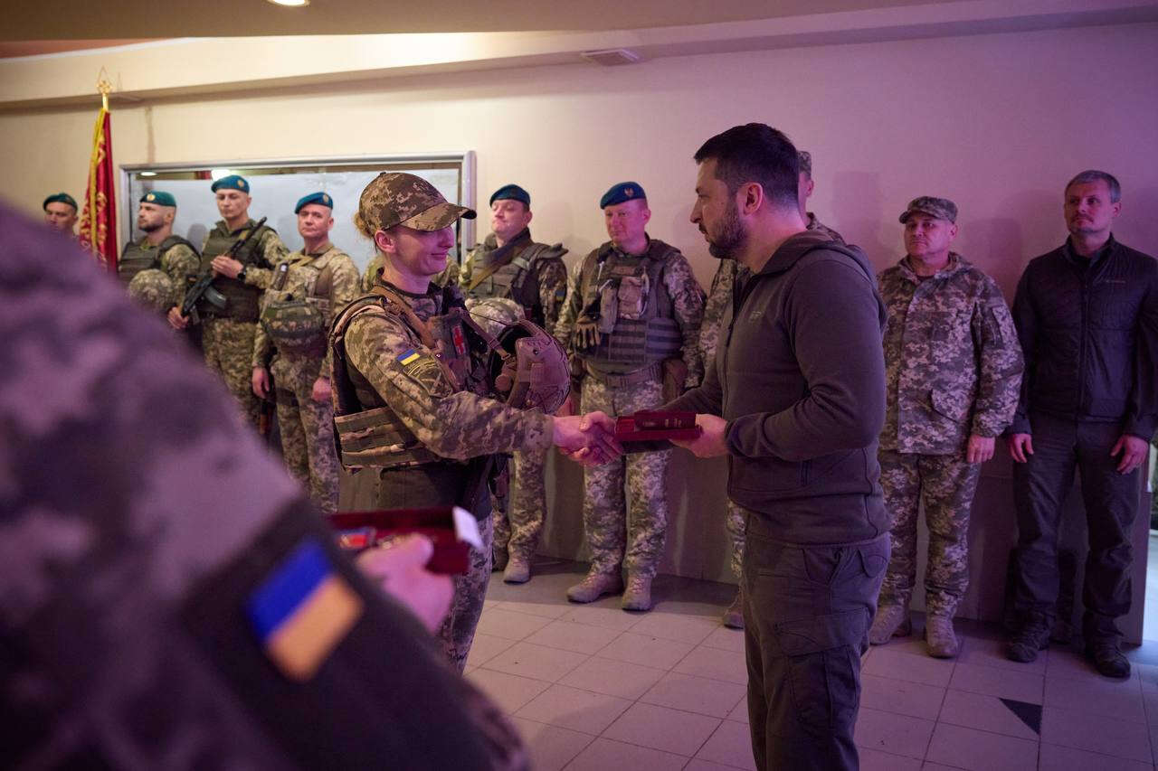 Deniz piyadeleriyle bir araya gelen Zelenskıy askerlere ödüllerini takdim etti.