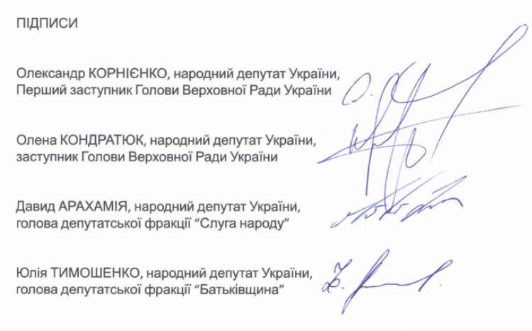 İlgili belge; Halkın Hizmetkarı Partisi Başkanı David Arahamiya, Anavatan Partisi Başkanı Yuliya Timoşenko, Avrupa Dayanışması Partisi Eş Başkanı İrına Geraşçenko, Golos Partisi Başkanı Oleksandra Ustinova ve diğer milletvekili gruplarının temsilcileri tarafından imzalandı.