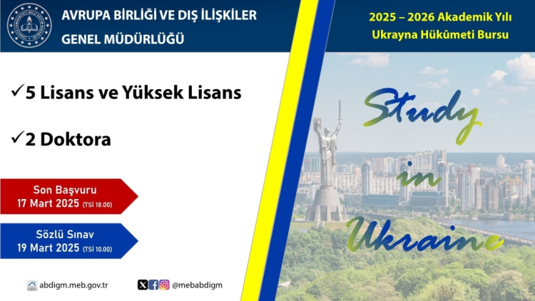 Ukrayna hükûmeti, lisans ve lisansüstü düzeyde yedi Türkiye Cumhuriyeti vatandaşına burs vereceğini açıkladı. Türkiye Cumhuriyeti Millî Eğitim Bakanlığının (MEB) 10 Ocak 2025 tarihinde resmî sayfasında yaptığı açıklamaya göre; Ukrayna Hükûmeti, “Study in Ukraine” (Ukrayna’da Eğitim) projesi kapsamında lisans ve yüksek lisans alanlarında toplam beş adet; doktora alanında ise iki adet burs tahsis etti.