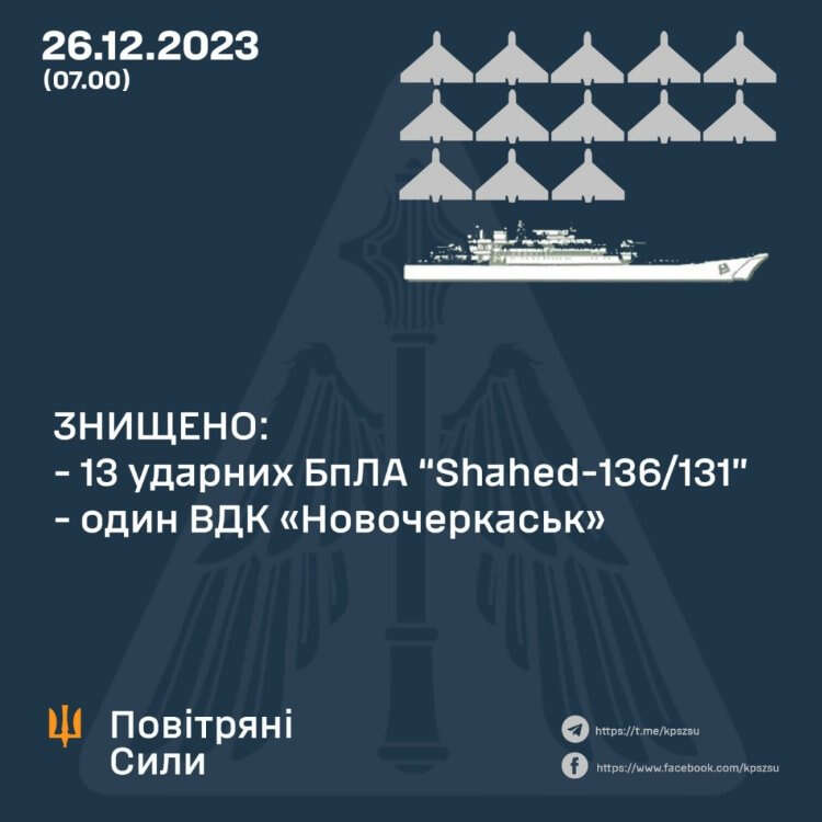 İşgalci Rusya, 25 Aralık’ı 26 Aralık’a bağlayan gece, Ukrayna’nın farklı bölgelerine İran yapımı kamikaze silahlı insansız hava araçları (SİHA) ile saldırı düzenledi. Ukrayna ordusu, işgalcilerin kullandığı 19 SİHA’nın 13’ünü düşürdü.