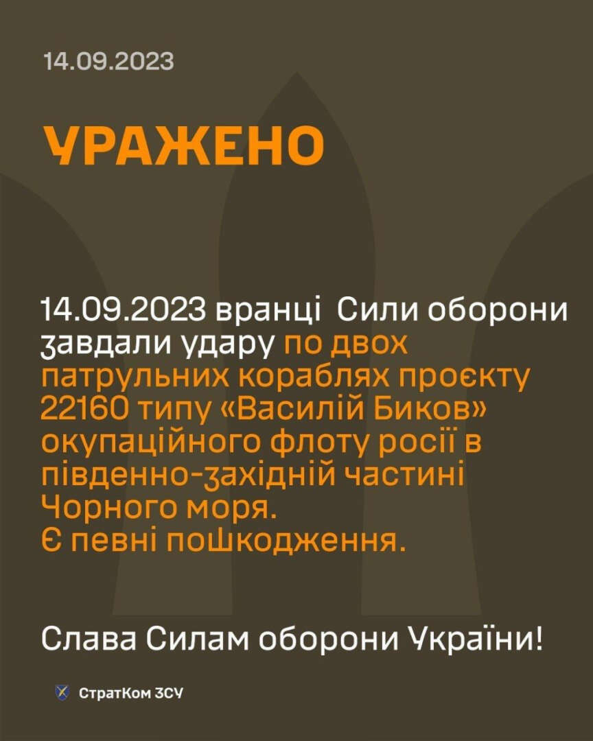 Ukrayna Silahlı Kuvvetleri Strateji Komitesi, konuya ilişkin, "14 Eylül 2023 sabahı Ukrayna ordusu, Karadeniz'in güneybatı kesiminde Rus işgal filosuna ait Vasiliy Bıkov tipi iki devriye gemisini vurdu. Bir miktar hasar var" açıklamasını yaptı.