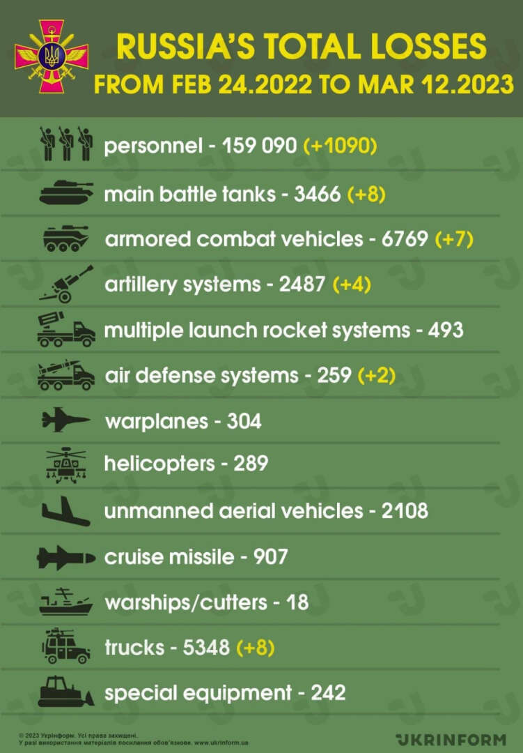 İşgalci Rus ordusu, Ukrayna'da 12 Mart 2023 itibarıyla 159 bin 90'ın üzerinde asker kaybetti.