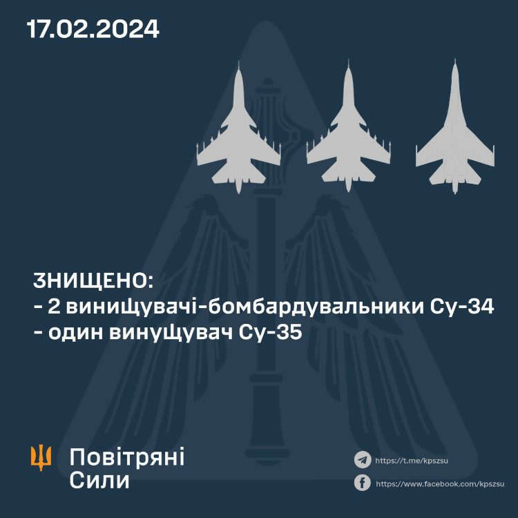 Ukrayna ordusunun, 17 Şubat 2024 tarihinde ülkenin doğusunda Rus ordusuna ait 3 savaş uçağını düşürdüğü bildirildi.